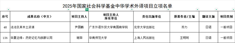 本网讯 近期,全国哲学社会科学工作办公室正式公布2025年国家社会科学基金中华学术外译项目立项名单。我校尹国鹏老师凭借扎实的研究基础、前沿的研究视角与严谨的申报论证,成功获批国家社科基金中华学术外译项目立项;与此同时,我校谢阳老师在攻读博士期间亦成功获批国家社科基金中华学术外译项目。双喜临门的优异成绩,充分彰显了学校在人文社科领域的科研实力与高质量人才培养成效,标志着学校科研发展水平稳步迈向新台阶。