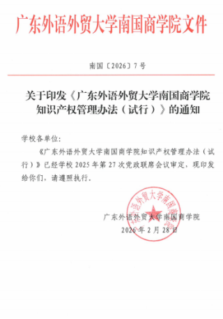 本网讯 近日,我校正式印发《广东外语外贸大学南国商学院知识产权管理办法(试行)》(南国〔2026〕7号,以下简称《办法》),从权属界定、流程优化、激励保障三方面作出系统规定,是我校贯彻落实国家创新驱动发展战略和知识产权强国战略的具体举措,也是学校规范办学、提质增效的关键行动。这对我校构建系统完善、运行高效的知识产权管理体系,激发师生创新创造活力,加快科研成果转化应用、提升科研成果价值具有重要意义。