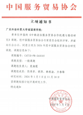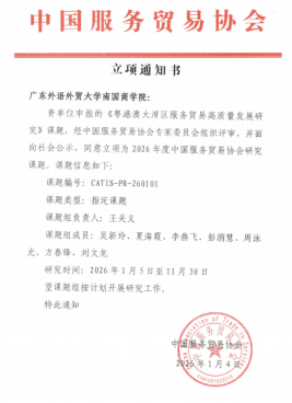 本网讯 近日,经中国服务贸易协会专家委员会组织评审并向社会公示,我校国际经贸规则研究中心申报的《粤港澳大湾区服务贸易高质量发展研究》与《中韩美妆服务贸易合作机遇与路径研究》两项课题,正式获批立项为2026年度中国服务贸易协会研究课题。