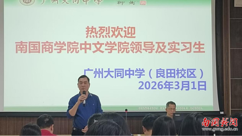 本网讯 为进一步深化产教融合,扎实推进实践教学工作,夯实学生就业基础,2026年3月1日至3月2日,文化与传播学院组织2022级汉语言文学专业19名实习生,分批次前往广州大同中学初中部,正式开启为期8周的教育实习之旅。学院党总支书记冯钿、辅导员乔旖旭带队走访,广州大同中学初中部冯剑雄主任及相关领导予以热情接待,两校携手搭建起理论与实践深度融合的师范生成长平台,助力实习生锤炼教学本领、衔接职场发展。