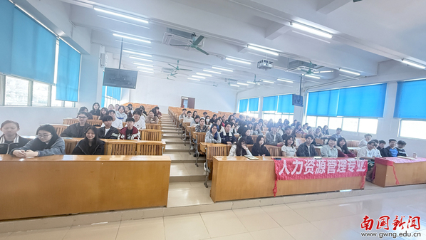 本网讯2026年3月12日下午,管理学院在人力资源管理专业实践教学可视化成果展上集中展示该专业在劳务招聘与智能招聘融合方面的教学成效。管理学院的毛俪霏等老师、广州聚薪企业管理有限公司江经理以及2023级、2024级、2025级、2025级人力资源管理(专升本)1班和2班共170名师生参会。