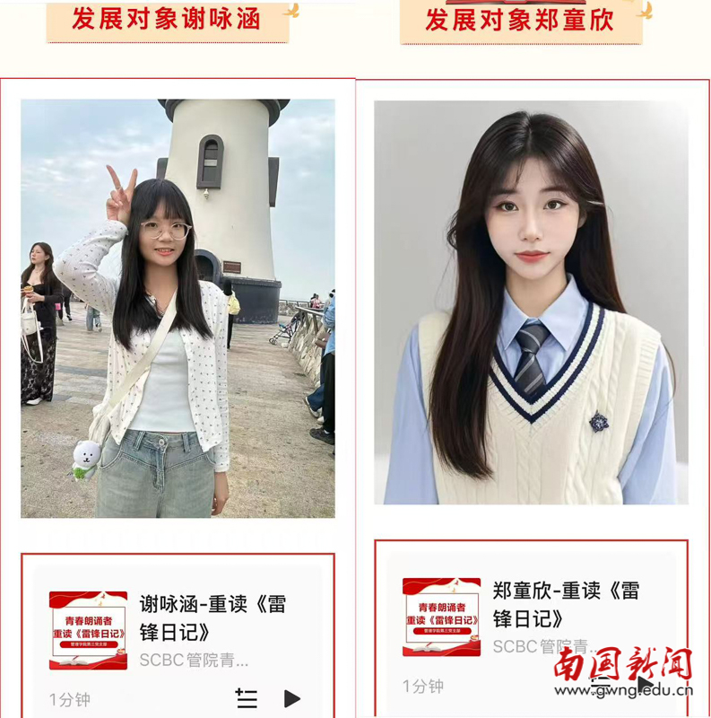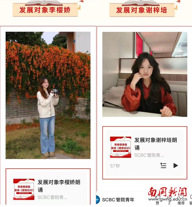 本网讯 为深入学习贯彻雷锋精神,不断创新学习形式,让雷锋精神真正走进同志们的内心、融入日常实践、扎根校园建设,管理学院第三党支部组织开展“读青春朗诵者-重读《雷锋日记》”特色主题活动。支部全体成员踊跃参与、全心投入,以深情诵读传递信仰力量,以静心感悟汲取榜样精神,在品读经典、锤炼思想的过程中,引导同志们立足校园为南国高质量发展添砖加瓦。
