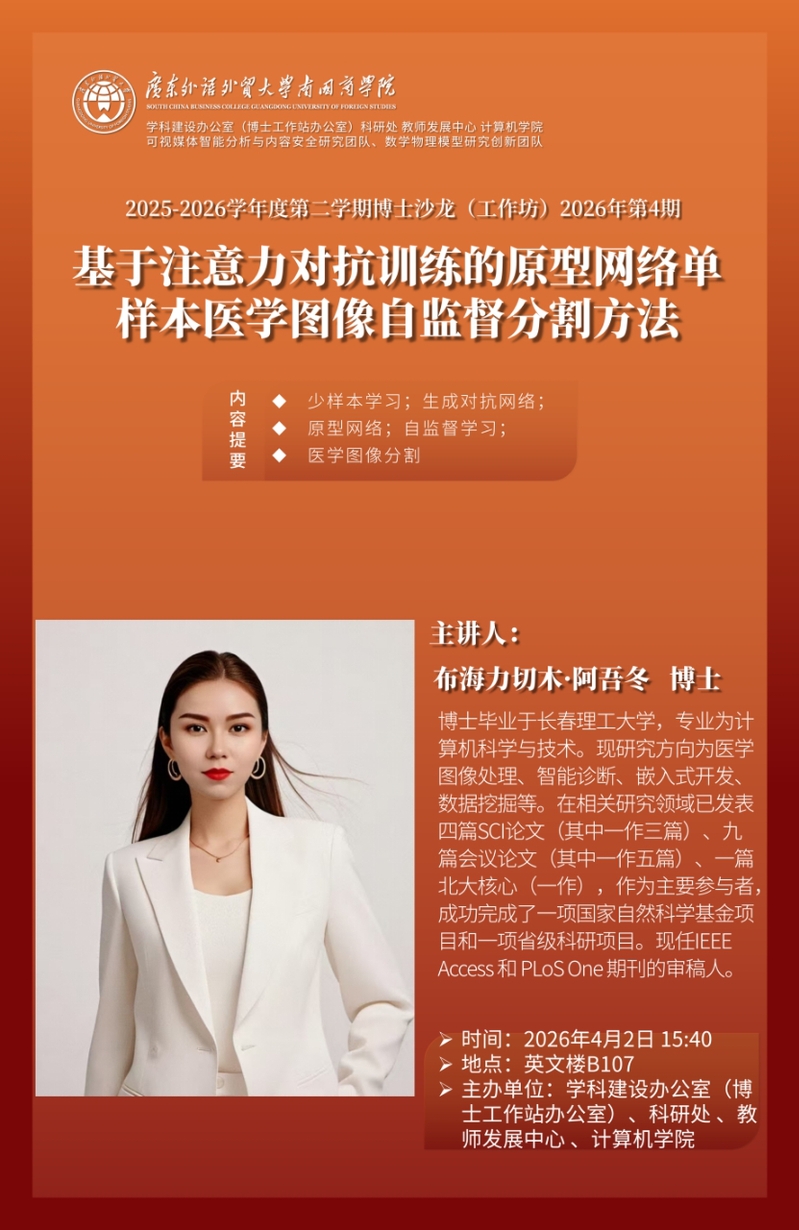 主讲人简介:布海力切木·阿吾冬博士毕业于长春理工大学,专业为计算机科学与技术。现研究方向为医学图像处理、智能诊断、嵌入式开发、数据挖掘等。在相关研究领域已发表四篇SCI论文(其中一作三篇)、九篇会议论文(其中一作五篇)、一篇北大核心(一作),作为主要参与者,成功完成了一项国家自然科学基金项目和一项省级科研项目。现任IEEE Access和PLoS One期刊的审稿人。
