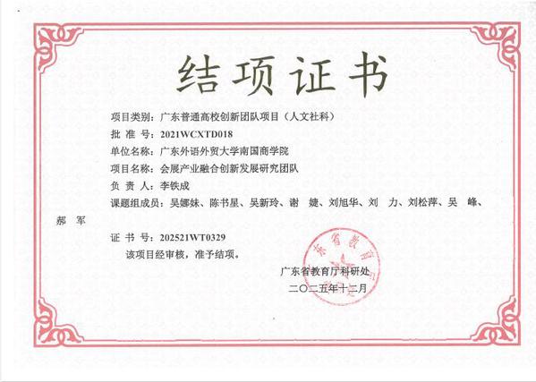 本网讯近日,广东省教育厅公布省级科研创新团队结项验收结果,我校管理学院李铁成教授主持的“会展产业融合创新发展研究团队”(结项证书编号:202521WT0329)顺利通过省级结项验收,成为我校首个通过省级结项验收的科研创新研究团队,标志着我校在省级科研创新团队建设方面取得重要进展。