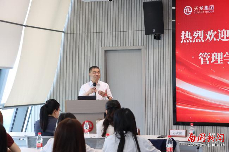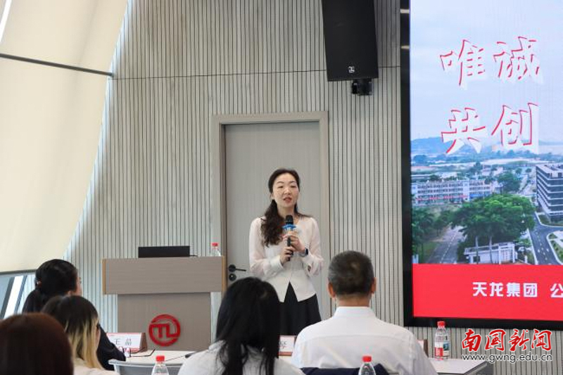在交流环节,双方围绕校企协同育人展开了热烈讨论。苏武俊院长指出,面对产业快速变革的时代背景,唯有深化产教融合,才能让人才培养真正对接市场需求、服务区域发展。天龙集团人力资源总监梅琴则从企业用人实践出发,分析了行业前景与人才需求的新趋势,并向师生们介绍了其原创的“求职锚定理论”。该理论倡导学生在职业规划中找准自身核心优势与行业关键需求的“锚点”,从而实现精准定位、差异化发展。
