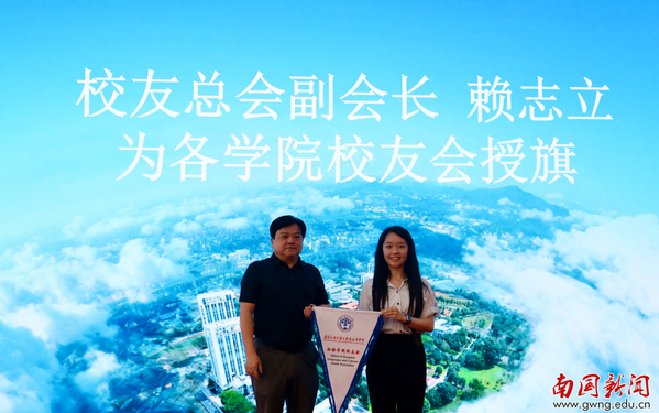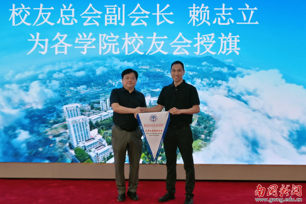 仪式环节,赖志立依次为西方语言文化学院、计算机学院校友会授旗。