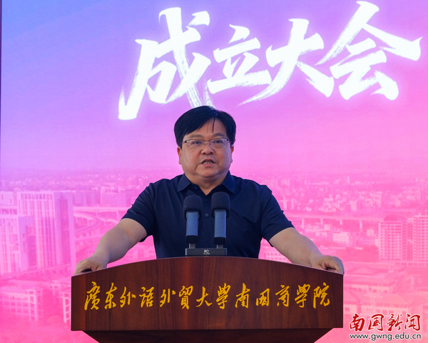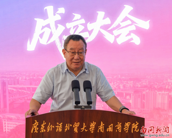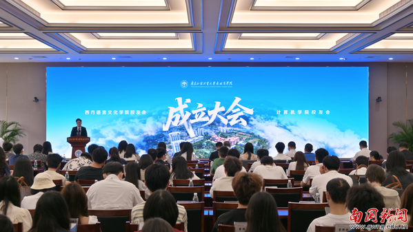 本网讯 2026年4月18日,广东外语外贸大学南国商学院西方语言文化学院、计算机学院校友会成立大会于学校H栋国际学术报告厅举行。本次大会由学校校友总会统筹推进,校友总会副会长、南国首任校长顾也力,校友总会副会长、副校长赖志立,各地方校友会代表,西语学院、计算机学院领导,教师和学生代表及历届校友代表齐聚一堂,共赴青春之约,共同见证两大院系校友会成立的历史性时刻。