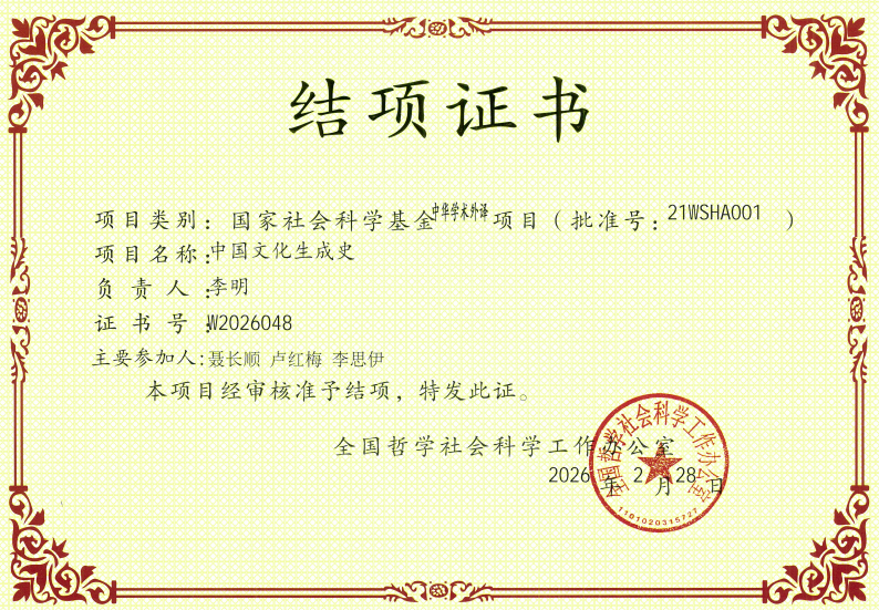 2026年2月,我校李明教授作为项目负责人主持的国家社会科学基金中华学术外译重点项目《中国文化生成史》(项目批准号:21WSHA001)顺利通过鉴定、正式结项,并获全国哲学社会科学工作办公室颁发结项证书(证书号:W2026048)。