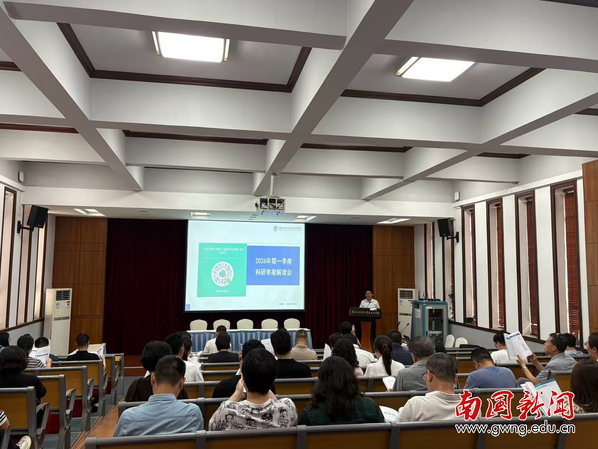 会议伊始,许军从数据解读和工作建议两个方面对2026年第一季度《南国科研季报》进行了深度解读。季报以详实的数据为支撑,全景式展示了各单位在科研参与度、项目申报活跃度、成果产出质量及学术交流频次等方面的亮眼表现。许军副处长同时对2026年上半年各类科研项目申报工作进行了全盘动员,明确了关键时间节点与申报要点,为各单位高效推进项目申报提供了清晰的行动指南。
