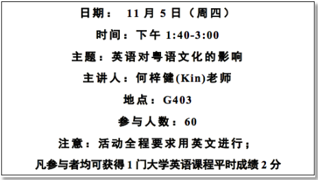 三:活动形式:主讲教师将带领大家了解粤语文化的根基,以及英语影响粤语文化的原因及发展。讨论问题:粤语散装英语的成因和发展是什么?