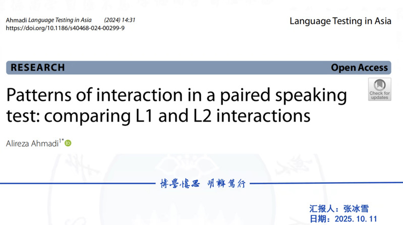 10月11日晚,大学英语教师发展研究所第三十九期学术研讨会于线上顺利举行。本次研讨会聚焦“配对口语测试中的互动模式”研究,与华南理工大学徐鹰教授博士生团队导读合作进行。本次研讨会由徐鹰教授主持,博士生张冰雪担任论文导读人,围绕Alireza Ahmadi 2024年发表于Language Testing in Asia的论文“Patterns of Interaction in a Paired Speaking Test: Comparing L1 and L2 Interaction”展开深入探讨,研究所部分成员参与研讨。