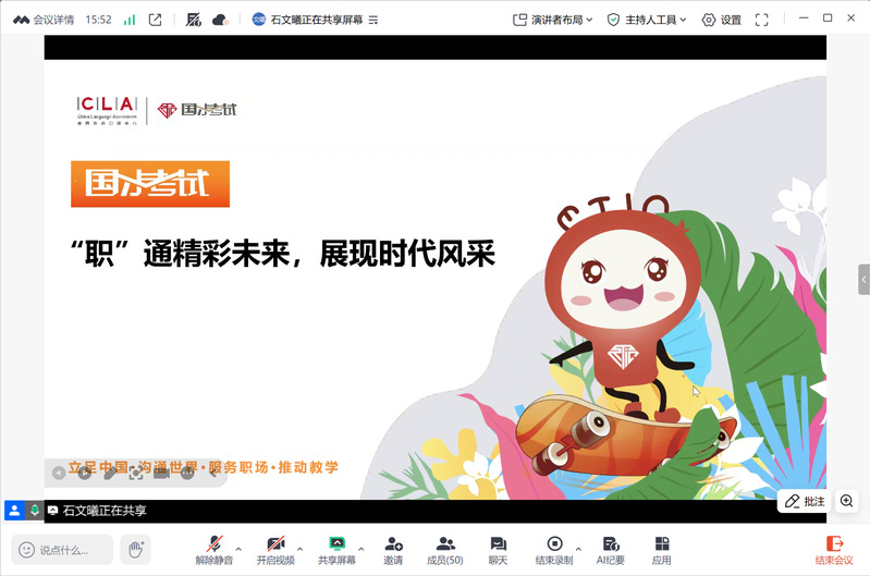 为帮助学生把握外语学习趋势,明确职业发展路径,10月17日晚19:00,我部以线上形式举办国才宣讲会。2022级学生、《商务英语》课程学生及有意向参加国才考试的同学上线参会。会议由大英部主任助理于恩泽主持,邀请外研社高等营销中心华南国才专员石文曦主讲。