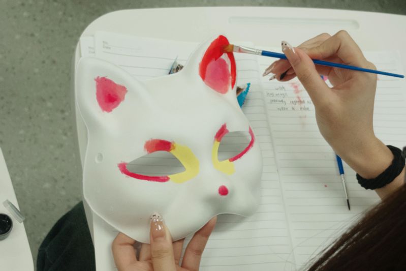 趣味互动环节将活动氛围推向高潮。现场为同学们精心准备了空白面具、环保颜料及装饰材料,大家化身“设计师”开启万圣节面具DIY创作:有人以狐狸、南瓜等经典元素为灵感,勾勒神秘图案;有人融入个性化设计,巧妙结合中西方文化符号,打造专属作品。