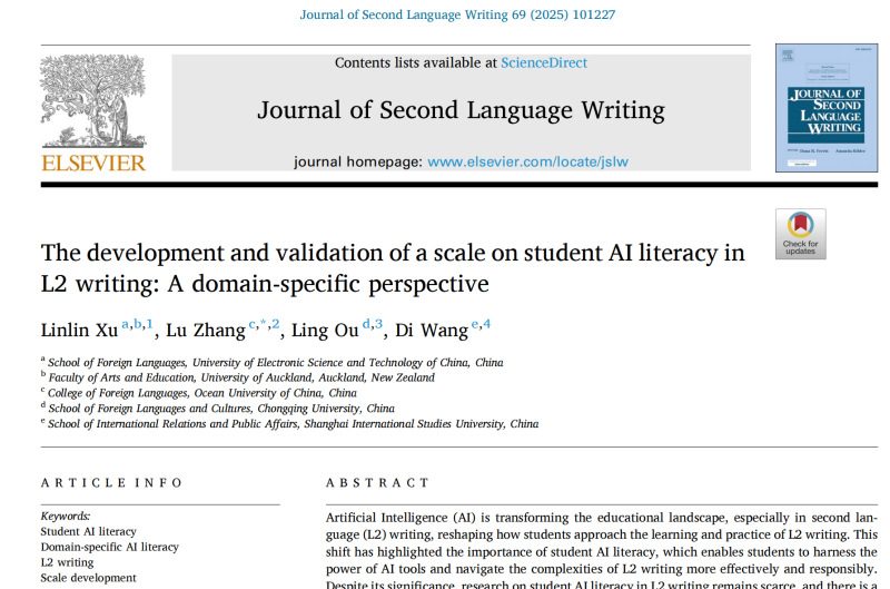 11月9日晚,大学英语教师发展研究所第四十期学术研讨会于线上顺利举行。本次研讨会聚焦“二语写作中学生AI素养量表的开发与验证:特定领域视角”研究,与华南理工大学徐鹰教授研究生团队导读合作进行。本次研讨会由徐鹰教授主持,陈同学担任论文导读人,围绕电子科技大学徐林林教授等学者2025年发表于Journal of Second Language Writing的论文“The development and validation of a scale on student AI literacy in L2 writing: A domain-specific persepective”展开深入探讨。研究所王瑞英所长及部分成员参与研讨。