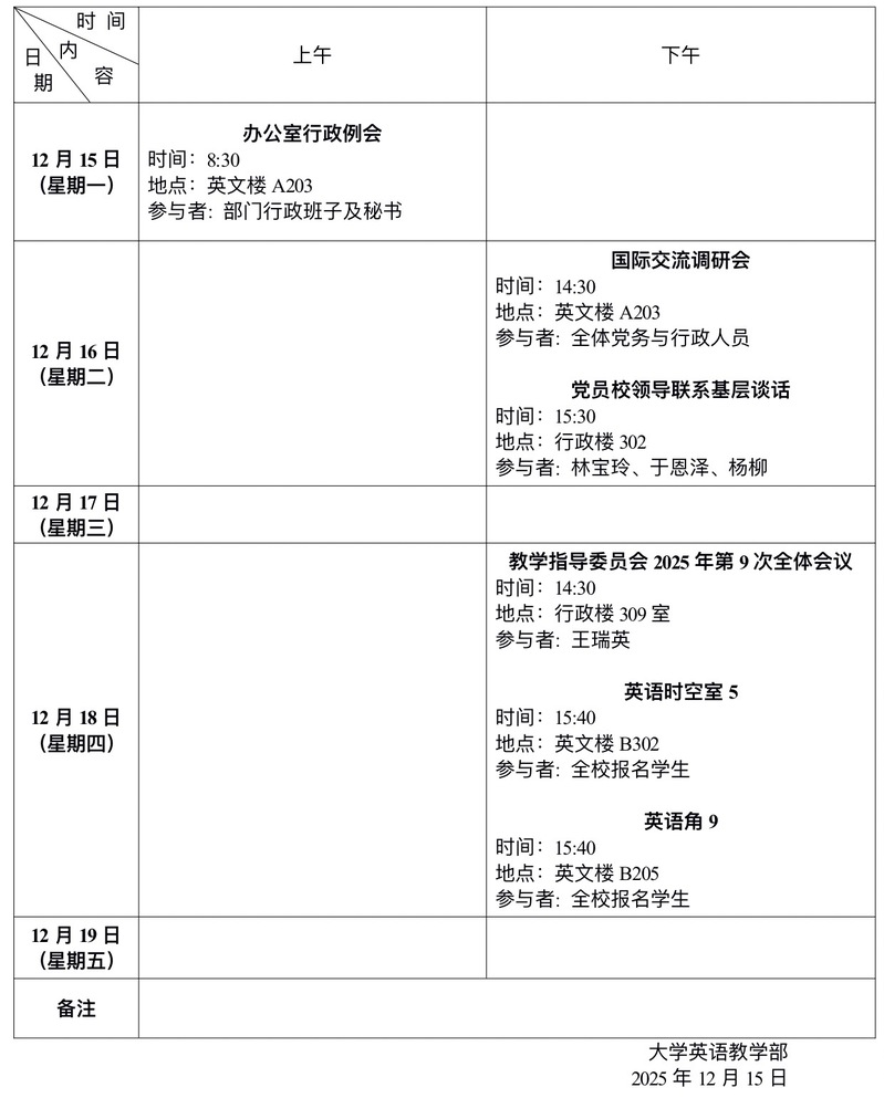 2025年秋季学期第15周会议和活动安排表