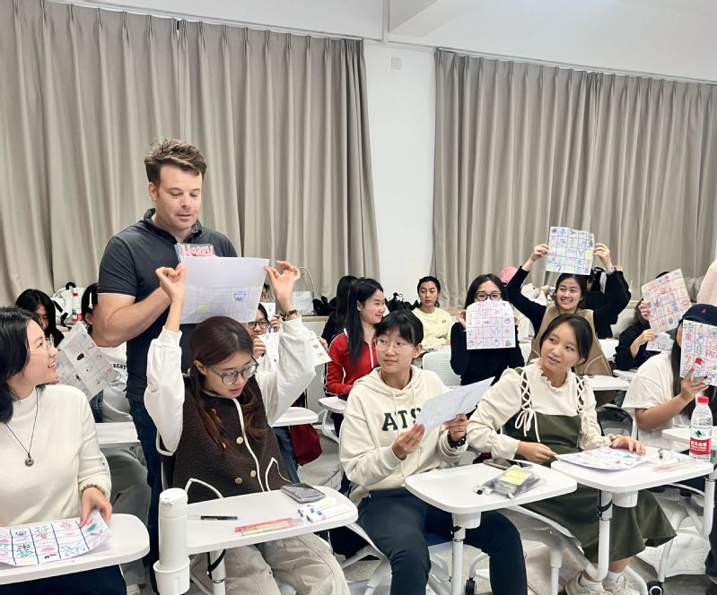 游戏环节中,Ryan老师细致描述各类圣诞标志物的外形特征与背后文化知识,同学们全神贯注聆听,精准捕捉关键信息,一旦匹配表格内容便迅速标记。随着描述不断推进,现场氛围愈发热烈,大家紧盯表格、专注应答,盼着率先达成连线目标。当首位同学高声喊出“Bingo”时,教室瞬间响起阵阵欢呼;后续多名同学接连闯关成功,欢声笑语里满是收获的喜悦与成就感。