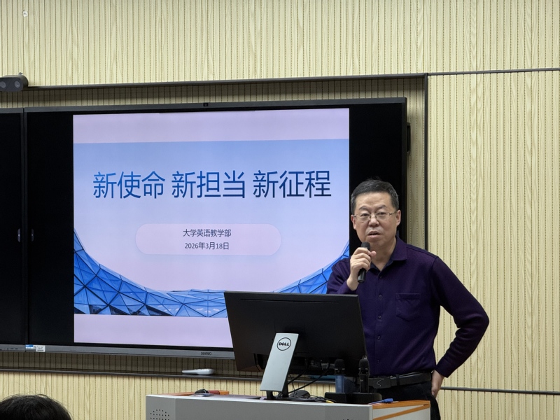 王铭玉作总结讲话。他对大英部过往成绩给予充分肯定,并对新班子提出殷切期望。他强调,大英部是学校充满朝气与希望的奋斗集体,新班子要做好“规定动作”与“自选动作”。他特别指出,要深化教学改革,构建多元化课程体系;创新教学模式,积极运用AI技术赋能教育;强化学业支持,抓好四六级与考研辅导,凸显部门贡献;更要打造学术共同体,推进有组织科研,实现成果共享。