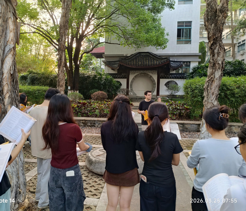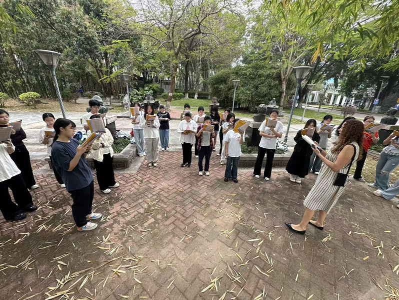 清晨的南国校园,鸟语花香间多了一道独特风景。为深入践行“随时随地学外语、讲外语、用外语”理念,本学期大学英语教学部持续开展外教领读活动。外教们将晨读从教室延伸至户外广场、文化长廊,用地道发音引领、情景化互动交流,让学生在真实语境中“活学活用”,真正实现“三随”理念的内化与外显,用朗朗书声开启学子活力一天。