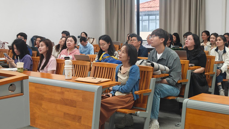 于恩泽老师以“四级翻译融入日常教学思路探讨”为题,从考情分析、学情分析、教学要点和日常融入四个维度展开,解读了四级翻译的考核要求及评分标准,针对学生群体多样化特点,提出了“打碎重组”、“以句为纲”等教学要点,展示了通过单元主题导入翻译练习、改写病句、划线部分翻译等日常融入方法。于老师特别强调了“立足考试要求、聚焦学生差异、夯实语言基础、融入日常教学”的实践路径。