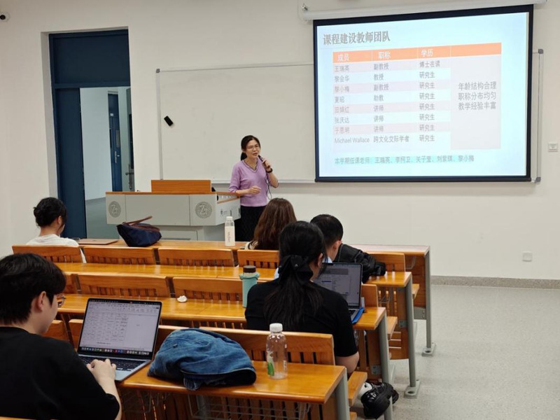 首先,黎小梅老师围绕《跨文化交际》课程展开分享。该课程2013年9月成为学校大学英语课程改革首批拓展课,2022年4月启动超星线上课程建设,同年9月开展线上线下混合式教学,完成数字化转型。课程团队由王瑞英副教授牵头,汇聚多位骨干教师,更有跨文化交际学者Michael Wallace加盟,师资力量雄厚。团队搭建了含慕课视频、自制课件、任务库、AI实践库等在内的多元资源体系,依托学习通平台,线上开展自主学习,线下设计抢答、情景表演、案例分析等互动活动,助力学生提升跨文化交际能力。