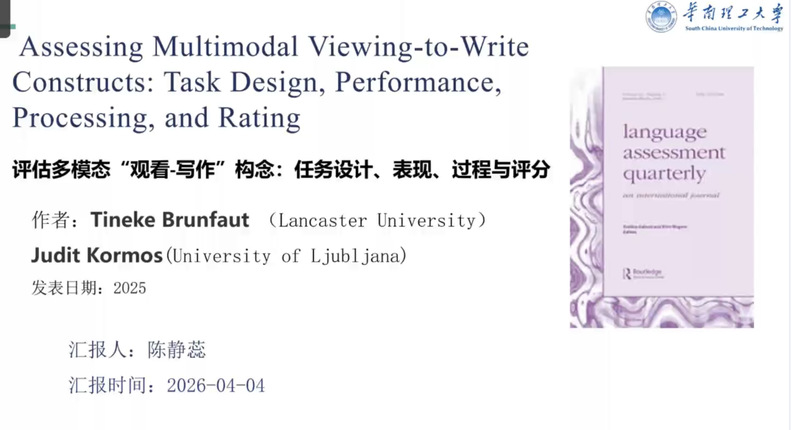 4月4日上午,大学英语教师发展研究所第五十期学术研讨会在线上顺利举行。本次研讨会由徐鹰教授主持,硕士生陈静蕊担任主讲导读,研究所部分成员通过线上方式参与研讨。本次研讨会的议题聚焦于“多模态语言在第二语言正式评估中的应用”,深入研读并讨论了Tineke Brunfaut与Judit Kormos于2025年发表于Language Assessment Quarterly期刊的论文“Assessing Multimodal Viewing-to-Write Constructs: Task Design, Performance, Processing, and Rating”。