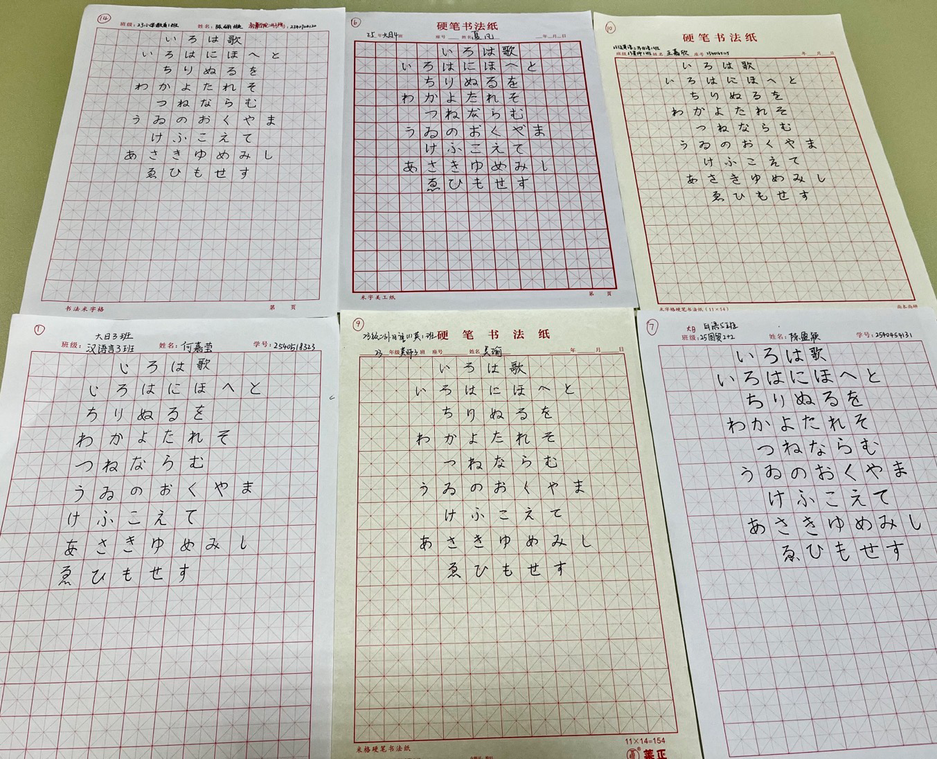 本次大赛分为专业组和非专业组两个赛道。专业组面向日语系2025级1、2、3班学生,非专业组则面向选修二外日语(1)和大学日语(1)课程的同学。比赛中,同学们积极参与、专注书写,展现出良好的学习风貌,赢得了评委老师的一致认可。经各班负责教师初步筛选,专业组与非专业组分别有15份和16份优秀作品晋级决赛。决赛阶段由日语系外教池田老师、张耀武教授及傅冬芳老师共同评审,从众多佳作中最终评定出一、二、三等奖及优秀奖若干。