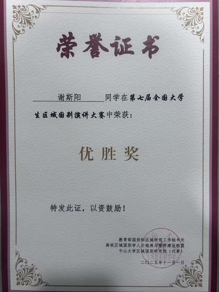 备赛阶段,谢斯阳同学高度重视、全力以赴。在闫庶峰老师的专业指导下,她围绕赛事主题,结合阿拉伯语专业特色,反复打磨演讲内容,从议题切入点的精准把控到语言表达的感染力提升,从逻辑架构的优化到临场应变的模拟训练,每一个环节都倾注了大量心血,为赛事做好了全方位的充分准备。比赛现场,面对来自全国的强劲对手,谢斯阳同学沉着冷静、从容自信,以清晰的逻辑、生动的表达阐述了对区域国别交流发展的深刻见解,展现出扎实的专业积累与出色的临场发挥能力,最终赢得评委认可,斩获优胜奖。