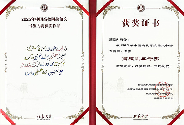 近日,2025年末圆满落幕的中国高校阿拉伯文书法大赛获奖证书正式送达我校。在本次赛事中,我校阿拉伯语系学子凭借扎实的专业功底与精湛的书写技艺荣获高校组三等奖,学校获评优秀组织奖。
