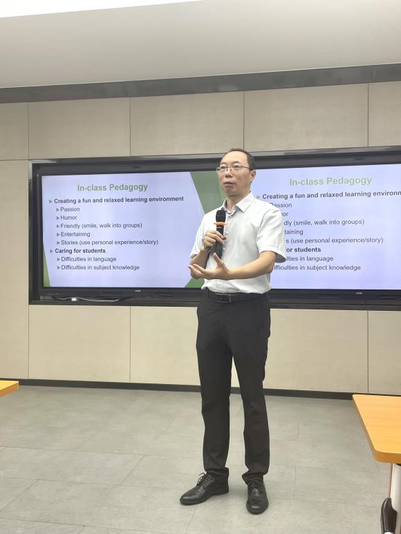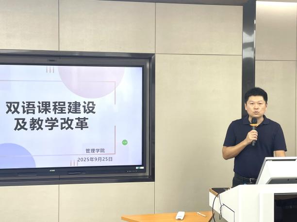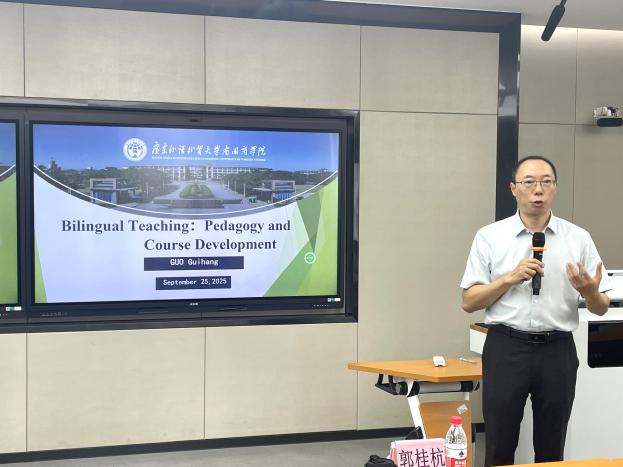 9月25日下午,管理学院在G304举办《双语课程建设及教学改革》专题讲座。本次讲座由管理学院副院长陈书星主持,特邀我校副校长郭桂杭作专题培训,旨在进一步提升教师双语教学水平,助力国际化人才培养。