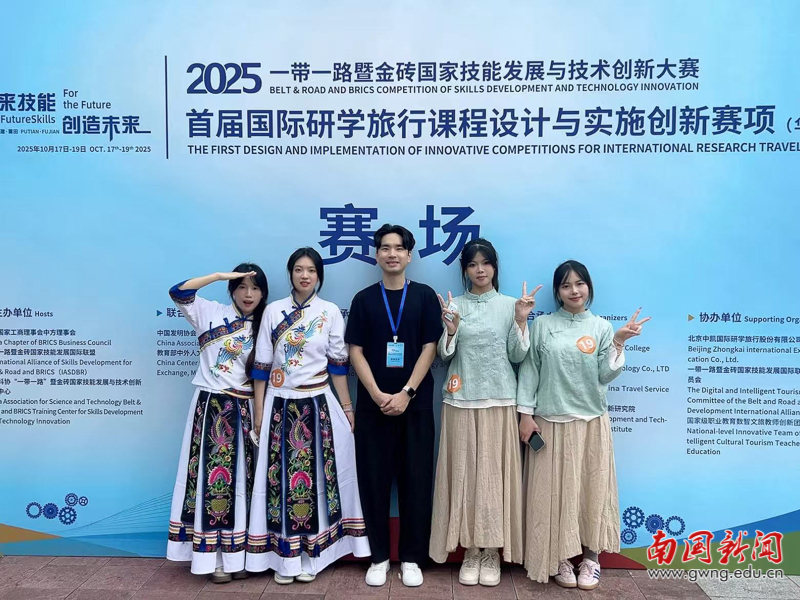 10月17日至19日,2025年一带一路暨金砖国家技能发展与技术创新大赛首届国际研学旅行课程设计与实施创新赛项(华南赛区)圆满落下帷幕。此次大赛吸引了中山大学、厦门大学、厦门理工学院等华南地区多所高校参赛,竞争激烈,共设一等奖1名,二等奖2名,三等奖3名。由我校酒店管理专业和旅游管理专业学生组成的参赛队伍表现出色,荣获本科组总分第2名,获得二等奖。