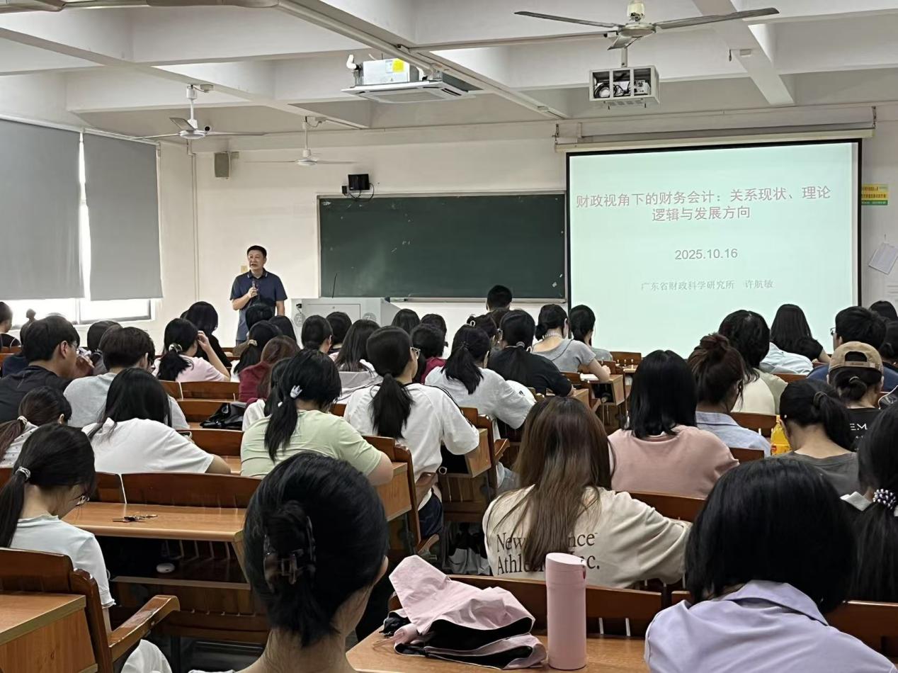 2025年10月16日,广东省财政科学研究所所长许航敏博士应邀莅临我院,为会计学专业学生带来了一场主题为“财政视角下的财务会计:关系现状、理论逻辑与发展方向”的学术讲座。本次讲座旨在从财政视角深入剖析财务会计的本质、功能及其在现代国家治理中的重要作用,为学生构建跨学科、复合型知识体系提供新思路。