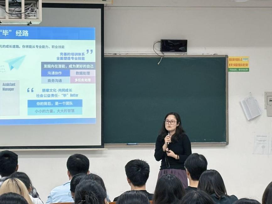 宣讲会以“公司介绍、职业发展规划、问答交流”三大环节有序推进。主持人黄小倩女士开场致欢迎辞,向到场嘉宾、师生表达诚挚谢意,明确宣讲会核心目标 —— 搭建校企沟通桥梁,助力学子明晰职业方向、做好就业准备,并强调此次合作对协同培育应用型人才的重要意义,为整场活动奠定专业亲切的基调。
