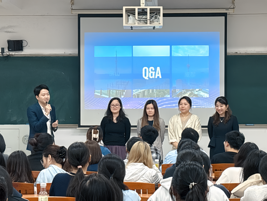 接着,人力资源部经理梁艳斐女士以“Be Here,‘毕’Better”为主题展开分享。她指出,职业规划需尽早启动,首份实习与工作对职业发展具有深远影响,建议学子在实践中观察优秀团队运作,主动提升沟通与任务处理能力,避免频繁跳槽带来的职业断层。针对AI普及的行业趋势,她建议学子结合自身优势精准定位职业目标,实现经验积累与兴趣发展的有机结合。同时,梁艳斐女士详细介绍了毕马威的全球布局与中国区31家分所的运营情况,重点阐释了KDC作为战略转型核心的重要价值,其佛山、南京、成都三大运营基地的业务范围与发展历程,让同学们对企业实力与发展前景有了更深刻的认知。