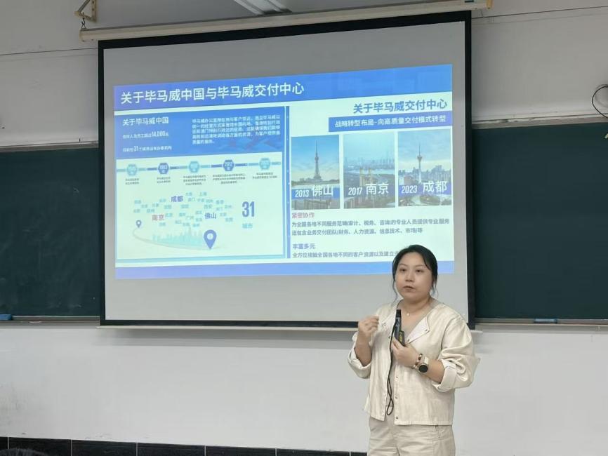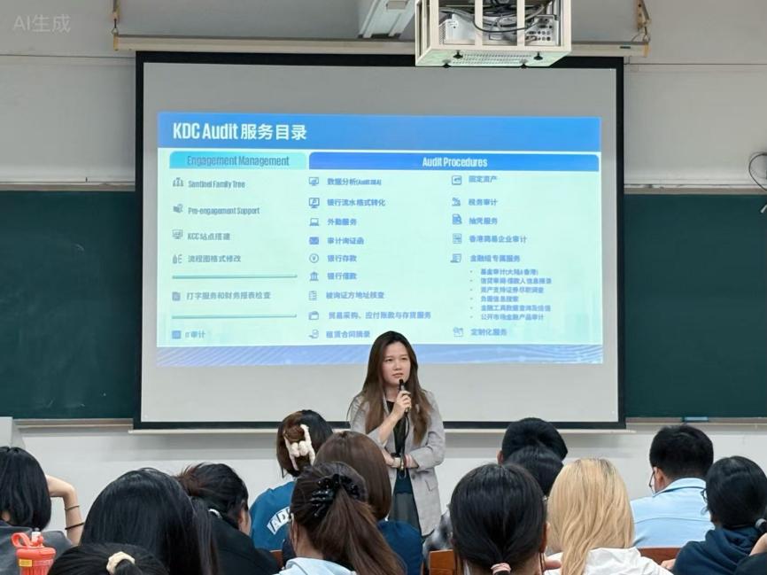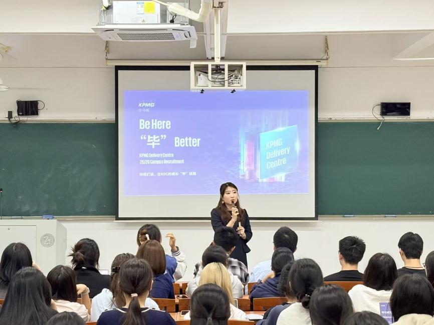 2025年10月29日晚,毕马威交付中心(KDC)校园招聘宣讲会在G303教室成功举办。本次宣讲会由KDC人力资源部经理黄小倩女士主持,KDC审计部经理黄炜颐女士、刘裕成先生,人力资源部经理梁艳斐女士、蔡文华女士及管理学院会计系副主任李玉平老师受邀出席。活动面向大三、大四学子,旨在全面介绍毕马威交付中心概况,系统解读校园招聘流程与实习申请技巧,是校企协同育人、培育高素质应用型人才的重要实践。
