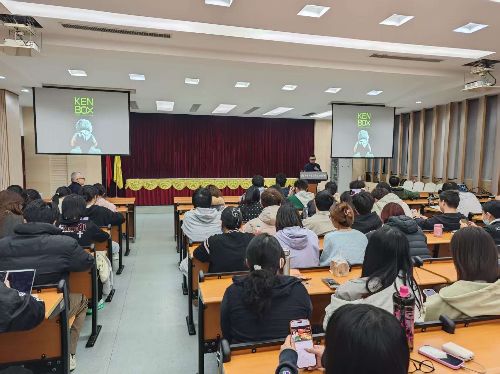 在互动环节,学生积极提问,涉及AI对传统设计师的影响、个人学习路径及内容同质化问题。庞健冬逐一解答,结合创意差异化提升竞争力。