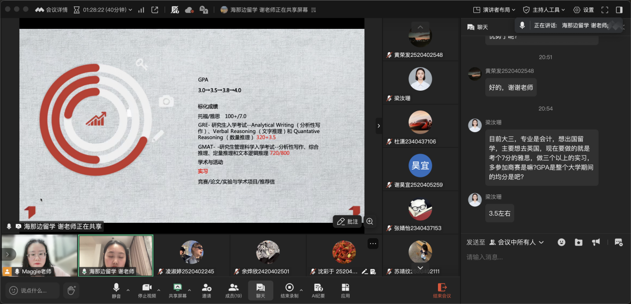 为帮助学生系统掌握留学申请要点,增强实战竞争力,工商管理系于12月8日晚顺利举办了“留学升学技巧分享”三随实践活动。活动采取线上讲座的形式,围绕留学规划、申请策略与面试模拟等内容展开,吸引了众多学生积极参与。