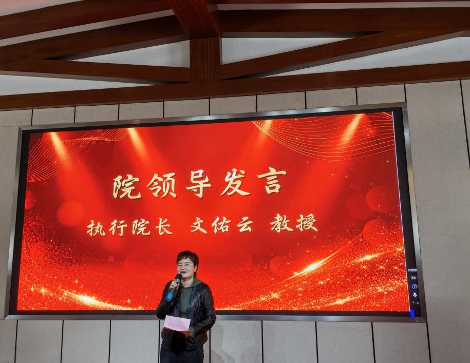 活动开始,执行院长文佑云回顾了学院在过去一年及“十四五”期间取得的卓越成就。文院长特别向辛勤付出的全体教师致以衷心感谢。她强调,正是老师们的敬业奉献与卓越工作,才使得学院在学科建设与社会服务中不断突破。展望2026年,文佑云院长寄语全院教师,她期望全体同仁在新的一年里继续并肩奋斗,坚守学术理想与管理智慧,在育人育才与学科建设上取得更大突破,继续以坚定信念和不懈奋斗,共同书写学院发展的新篇章。