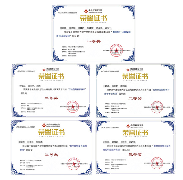 梁少毅老师和党雪老师指导的学生团队(24级金融学专升本李创顺、李迪朗、李嘉敏、吴嘉键、冼永彬、肖旭升)在数字银行模拟经营沙盘赛项中荣获第二名,获得团队一等奖。党雪老师指导的三人团队(24电子商务林佳彤、25会计专升本谢欣婷、25金融学刘洋)在保险创新科技赛项中获得团队二等奖,同时谢同学获得个人二等奖,刘同学和林同学分别荣获个人三等奖。梁少毅和邓永亮老师和指导的团队(22级市场营销郑铭萱、22级网络工程王越泽、23级汉语言李丽珊)在互联网金融创新与运营管理赛项中获得团队二等奖。党雪老师指导的团队(22金融学赖薇如、23电子商务冯希捷、23国贸何君君、22金融学叶颖颖)在智慧金融核心业务赛项荣获团队三等奖。其中,冯同学和何同学获得个人三等奖。梁少毅老师指导的团队(25金融学谢明珊、郑维嘉、24金融学专升本何梓健)在数字金融业务能力赛项获得团队三等奖,其中何同学获得个人二等奖,谢同学和郑同学获得个人三等奖。