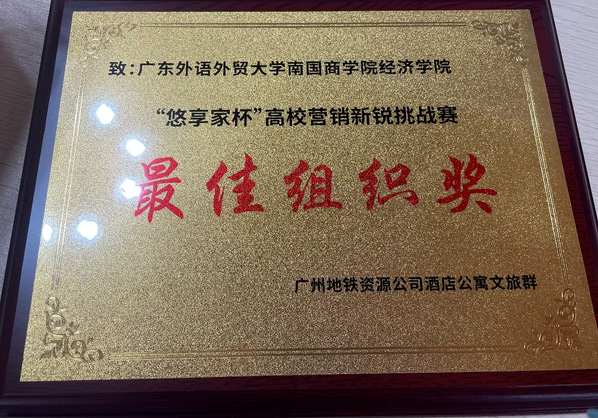 广州地铁资源公司向广外南国商学院经济学院颁发“最佳组织奖”,以表彰我院在赛事筹备、宣传动员与组织实施中的突出贡献。