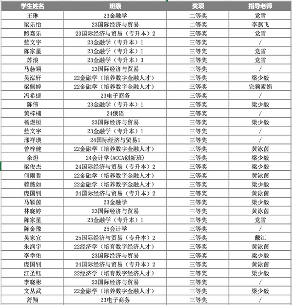 优异成绩的取得,离不开学院的高度重视与系统性培养。近年来,我院持续深化金融类专业教学改革,大力推进“理论教学+实践实训+学科竞赛”三位一体的人才培养模式。通过开设相关课程、举办专题讲座、配备专业竞赛指导教师、建立金融模拟实验室等多种途径,积极为学生搭建学以致用、锤炼技能的平台,有效提升了学生在真实市场环境下的分析决策与风险应对能力。此次大赛成果充分体现了我院应用型金融人才培养的质量,是学院深化教学改革、注重实践创新能力培养的生动体现。学院将继续以高水平学科竞赛为重要抓手,营造更为浓厚的学术与实践氛围,激励更多学子勤学笃行、锐意创新,为培养适应新时代金融行业发展的高素质专业人才不懈努力。(文:梁少毅)