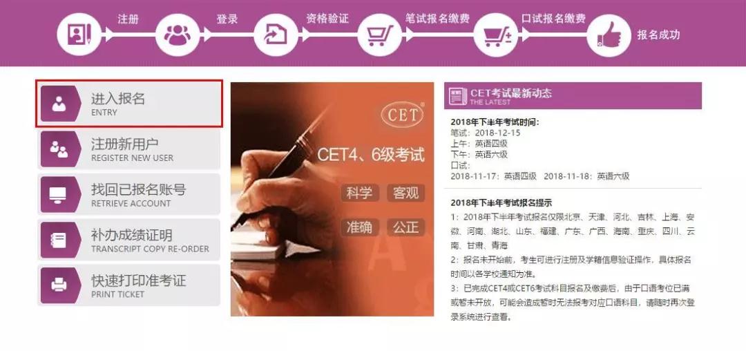 CETCET-SET采用全国统一网上报名系统,报名流程如下: