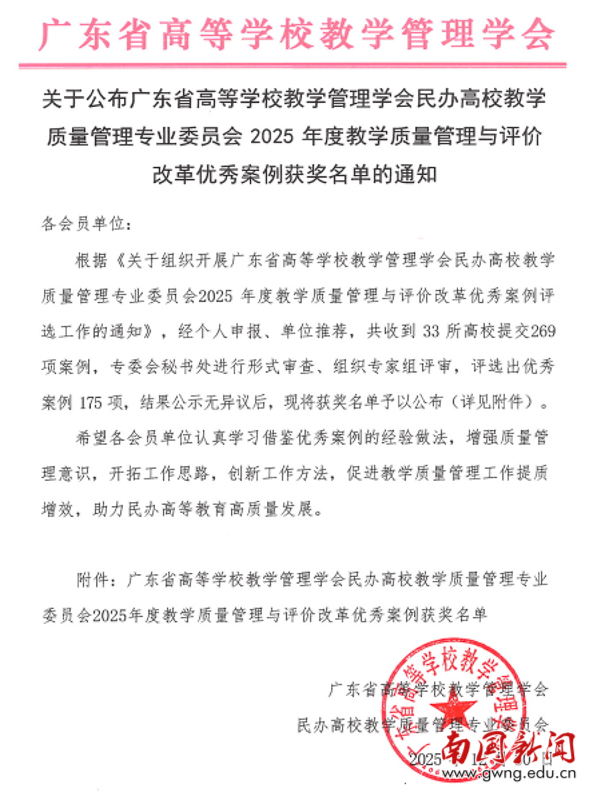 本网讯 近日,广东省高等学校教学管理学会民办高校教学质量管理专业委员会2025年度教学质量管理与评价改革优秀案例评选结果公布广东外语外贸大学南国商学院5项案例获奖(一等奖1项,三等奖2项,优秀奖2项)。