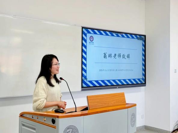会议伊始,教育学院副院长翁琳老师在致辞中,首先对我院与白云区图书馆双方合作开展的“多彩民族非遗传承”与“儿童游戏化信息素养”两大项目板块进行了详细的讲解,其不仅是馆校协同育人的生动范例,更是在真实社会场景中践行师范生培养目标的重要探索。翁院长对项目迄今取得的成果给予充分肯定,并对同学们的深度参与和辛勤付出表示赞许。她寄语全体同学,希望大家能格外珍惜这一弥足珍贵的实践机遇,将课堂所学理论真正转化为解决实际教学问题的能力,在活动中锤炼教学设计、课堂管理与跨文化沟通的综合素养。她鼓励大家不仅要“做好”,更要“说好”和“写好”,积极参与到后续课程文本梳理与可视化录制工作中,将生动的实践过程转化为可留存、可传播、可复用的理论成果与教学资源,让宝贵的经验惠及更多人。最后,翁琳副院长表达了对未来的美好期许。她祝福所有参与者在项目中收获成长与启迪,并期待在不久的将来,看到同学们呈现出的精彩作品与扎实的成长印记。
