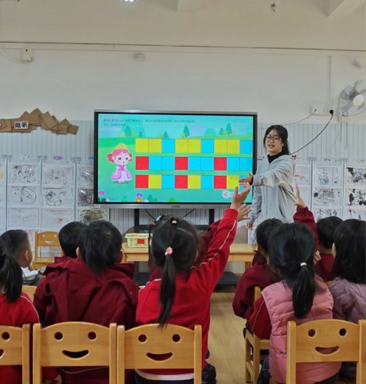“哗啦”,伴随着神秘的魔法音效,PPT里美丽的公主出现在魔法森林中.“公主迷路啦,只有破解规律密码才能回到规律之城的城堡,谁愿意当规律小卫士帮帮她?”老师话音刚落,孩子们立刻瞪大好奇的眼睛,小手举得高高的:“我愿意!”“我会找规律!”在热烈的回应中,孩子们瞬间代入小卫士角色,满心期待地踏上闯关之旅。