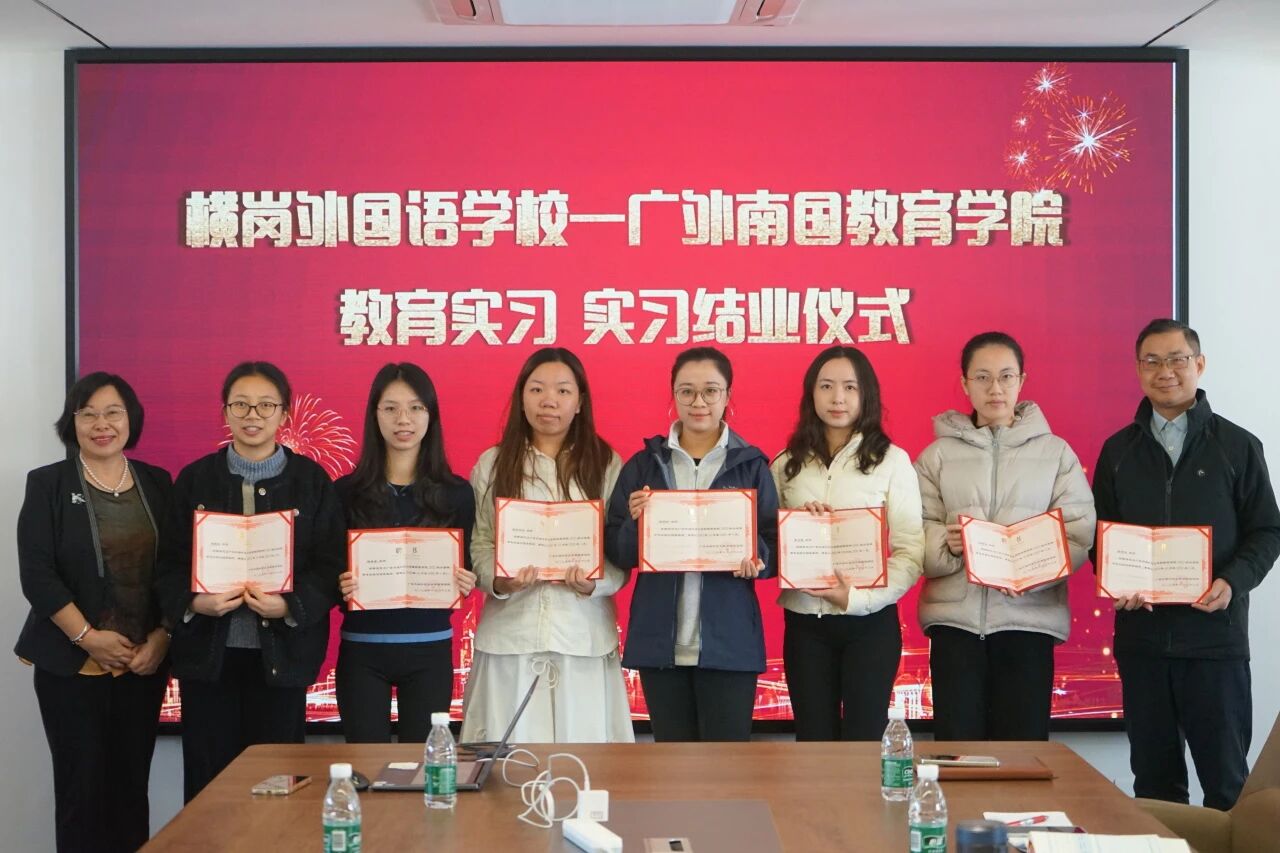 2026年1月5日下午15:00,广外南国教育学院实习生结业仪式在深圳市龙岗区横岗外国语学校会议室隆重举行。横岗外国语学校校长梁道安、特级教师梁添明、广外南国教育学院副院长肖建芳教授、学校全体指导教师及教育学院7名实习生齐聚一堂,共同见证这段实习征程的圆满收官。