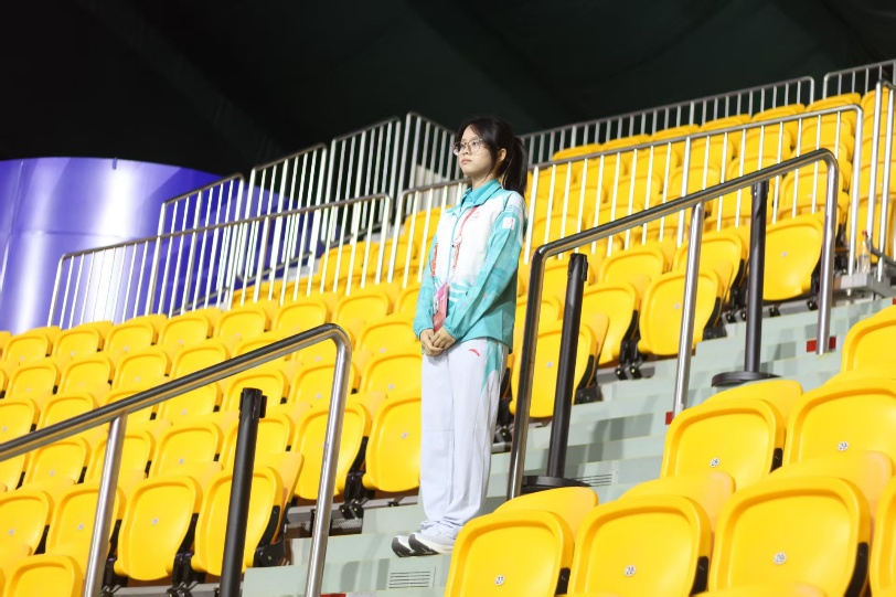 比赛期间,突发情况时有发生。一位媒体官员因比赛即将开始却找不到位置焦急不已,她立刻上前安抚,一边联系场馆老师确认位置,一边清晰告知最优路线;还有一回,有小朋友独自上厕所后找不到座位,她发现情况立即询问了家长的联系方式并凭借对方描述迅速找到对应观众区,安全地把小朋友送回座位。这些看似琐碎的小事,却让她真切感受到“被需要”的价值。