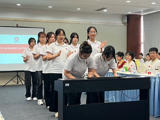 22级学前教育(师范)专业的师姐们准备了精彩的四手联弹经典曲目,以课程汇报的创意形式向24级新生表达最诚挚的欢迎。她们以娴熟的技巧和饱满的热情,在默契无间的配合下,欢快的节奏与轻松的旋律交织在一起,传递出的生命力与感染力,深刻体现了学前教育专业的独特魅力。