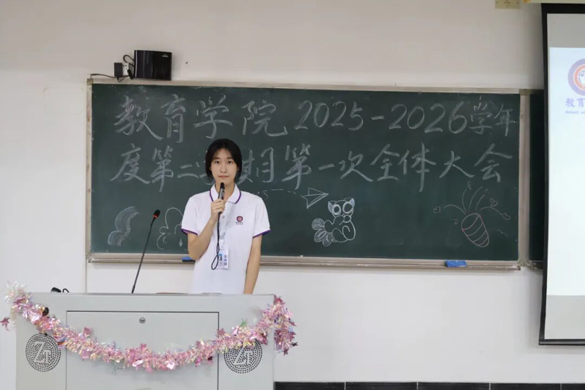 大会第一项议程,教育学院梁立为书记发言。梁立为书记结合教育学院团学工作实际与发展现状,向全体团学干部发表讲话,为后续工作开展指明方向。他首先对近期活动组织工作予以肯定,欣慰于活动筹备质量较以往有明显提升,重申活动的润色需建立在扎实的工作基础之上;同时着重强调学习的重要性,要求全体干部兼顾学业与工作,筑牢自身发展根基。随后,书记围绕团学工作开展提出多项核心要求:一是坚守工作初心,团委工作要坚持从严治团,以服务青年为本,做好桥梁纽带,凝聚青年力量、服务学院发展大局;二是树立品牌与创新意识,指出“无品牌则衰,无创新则竭”,指出部分工作存在墨守成规的问题,要求干部打破固有思维,在工作形式、内容上主动求新求变,以更高标准完成工作;三是围绕学院中心建功立业,针对学院专业赛事志愿活动提出学生参与积极性低等问题,强调随着学院规模扩大,团学工作需带动更多同学参与。最后,梁立为书记希望大家用心享受大学时光,在提升学业成绩的同时锤炼履职能力,以过硬的综合素质彰显教育学院学子的良好风貌,扛起传承学院荣光的责任。