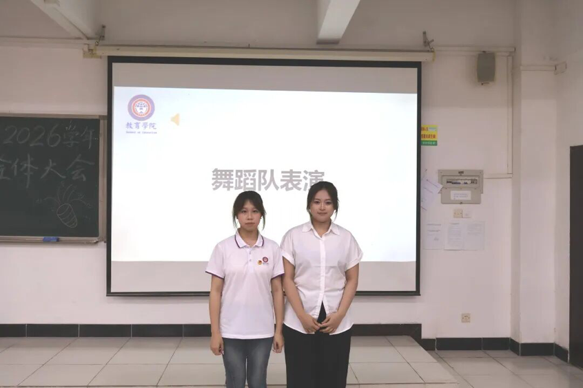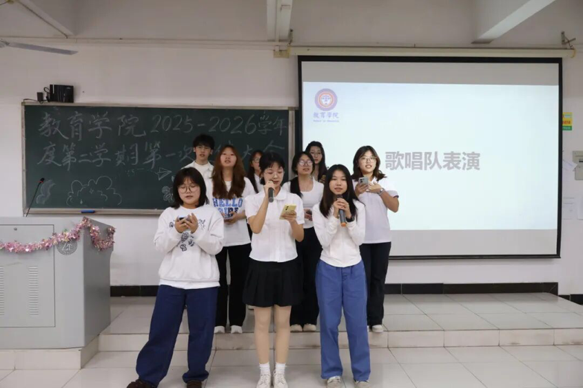 大会第五项议程,部门才艺展示。秘书部成员带来歌曲《我的未来式》,组策部成员带来歌曲《我们的明天》,文体部成员带来歌曲《青花瓷》,舞蹈队带来舞蹈《forever young》,歌唱队成员带来歌曲《歌曲串烧》。 这场表演不仅充分展现了教育学院团学成员的多元才华,也为全场留下了一段精彩难忘的回忆。