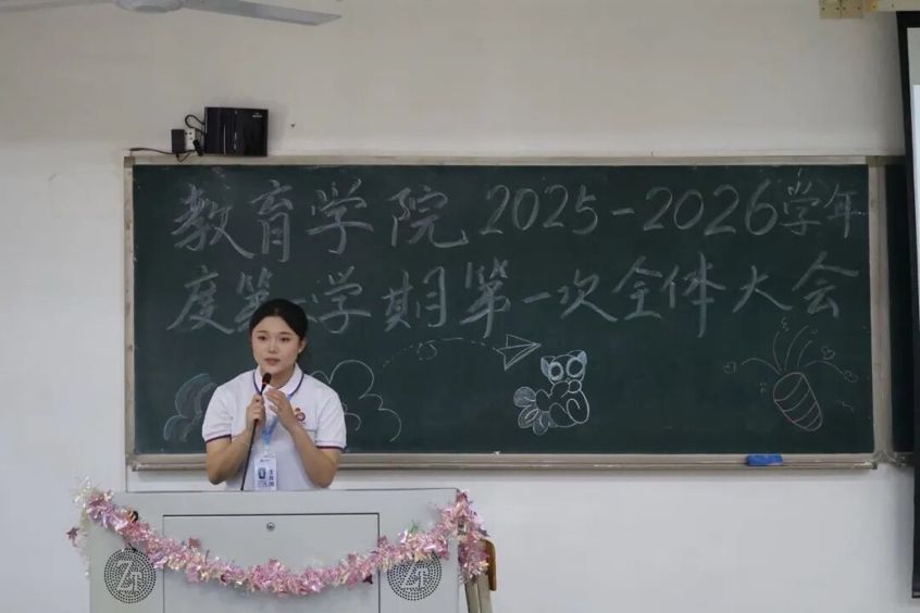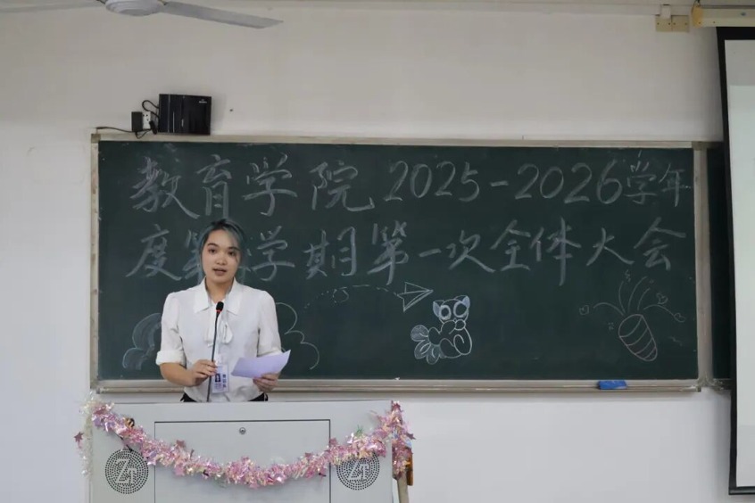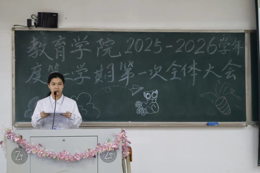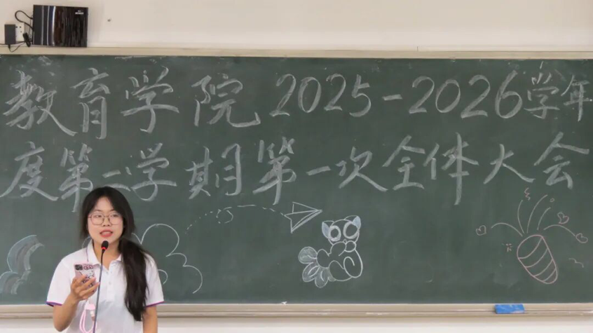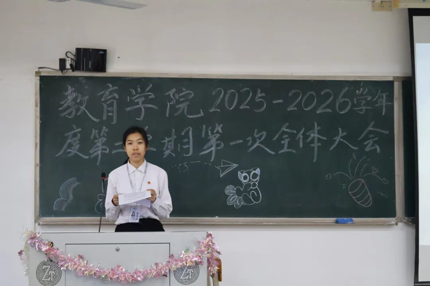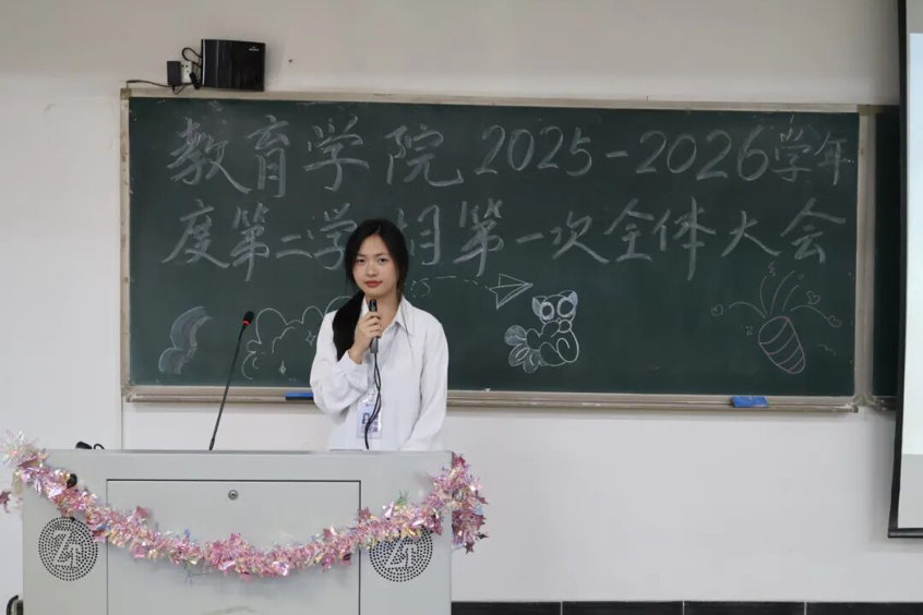 初心如炬,万象更新。教育学院团学于2026年3月12日14:30在G403教室顺利召开第二学期第一次全体大会。主持人欧恩佟为大会致开幕词,依次介绍出席本次大会的有教育学院党总支书记梁立为书记、团学指导老师罗璇老师、主席团成员及各部门负责人,并向到场的各位老师与同学们致以诚挚的感谢和热烈的欢迎。